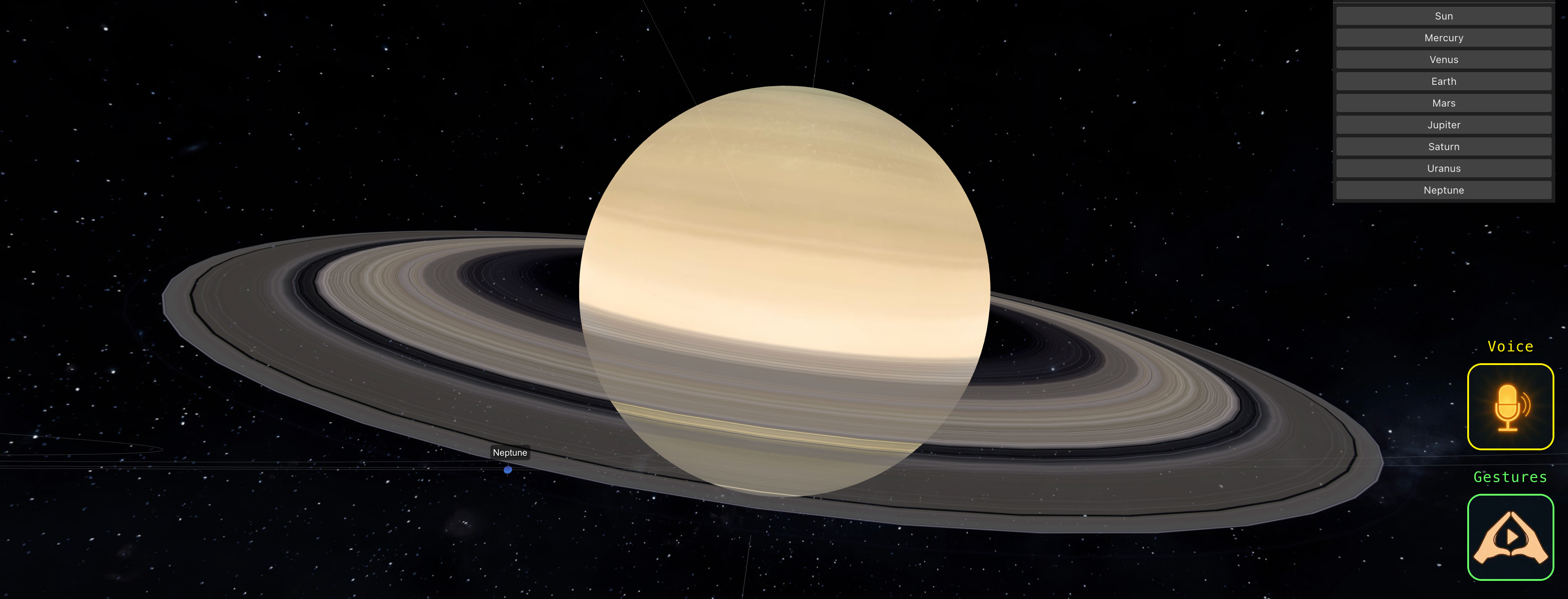 So the final idea, once executed — what I would call it a night — was: a more or less accurate solar system with Orbital controls using a mouse/trackpad, hand gestures via computer vision, and advanced voice control with a planet/sun camera tracking to talk to an AI astronomy tutor.