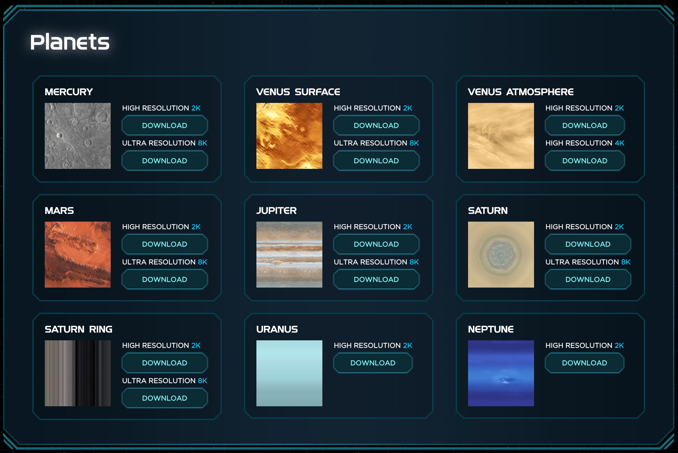 All textures: sun, planets, saturn ring, and the Milky Way were found on SolarSystemScope website. 2K resolution was enough, except for Milky Way, for which I took 8K.